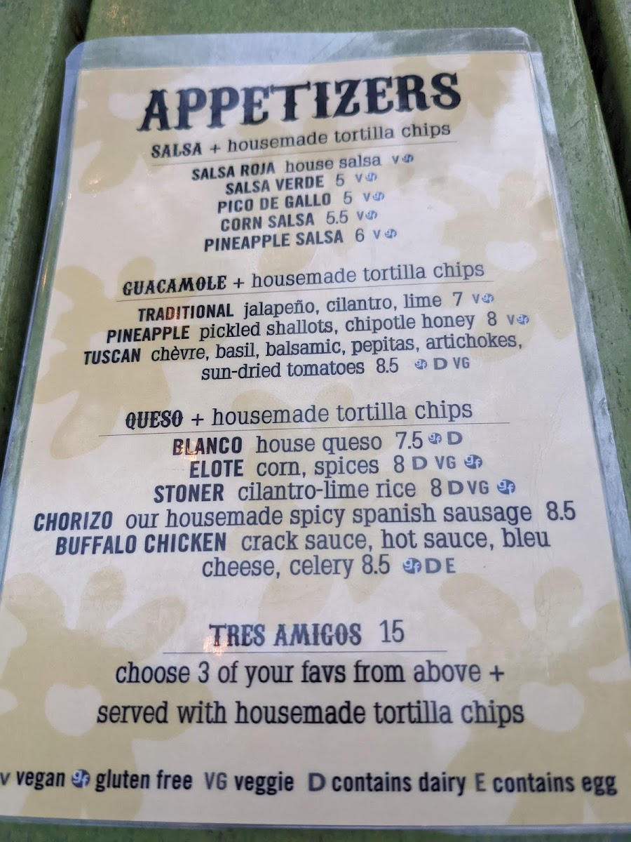 dub shell (flourcorn hardqueso), spice-rubbed chicken, chorizo, fresco, smoked cheddar, pico de gallo, corn salsa, chipotle honey bbq, salsa roja
