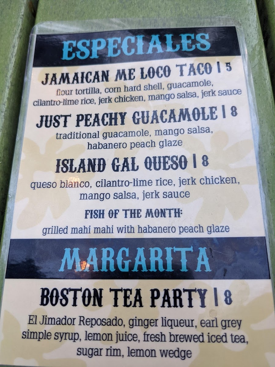 flour shell, guacamole, corn hard shell, jerk pork, peach salsa, cilantro-lime rice